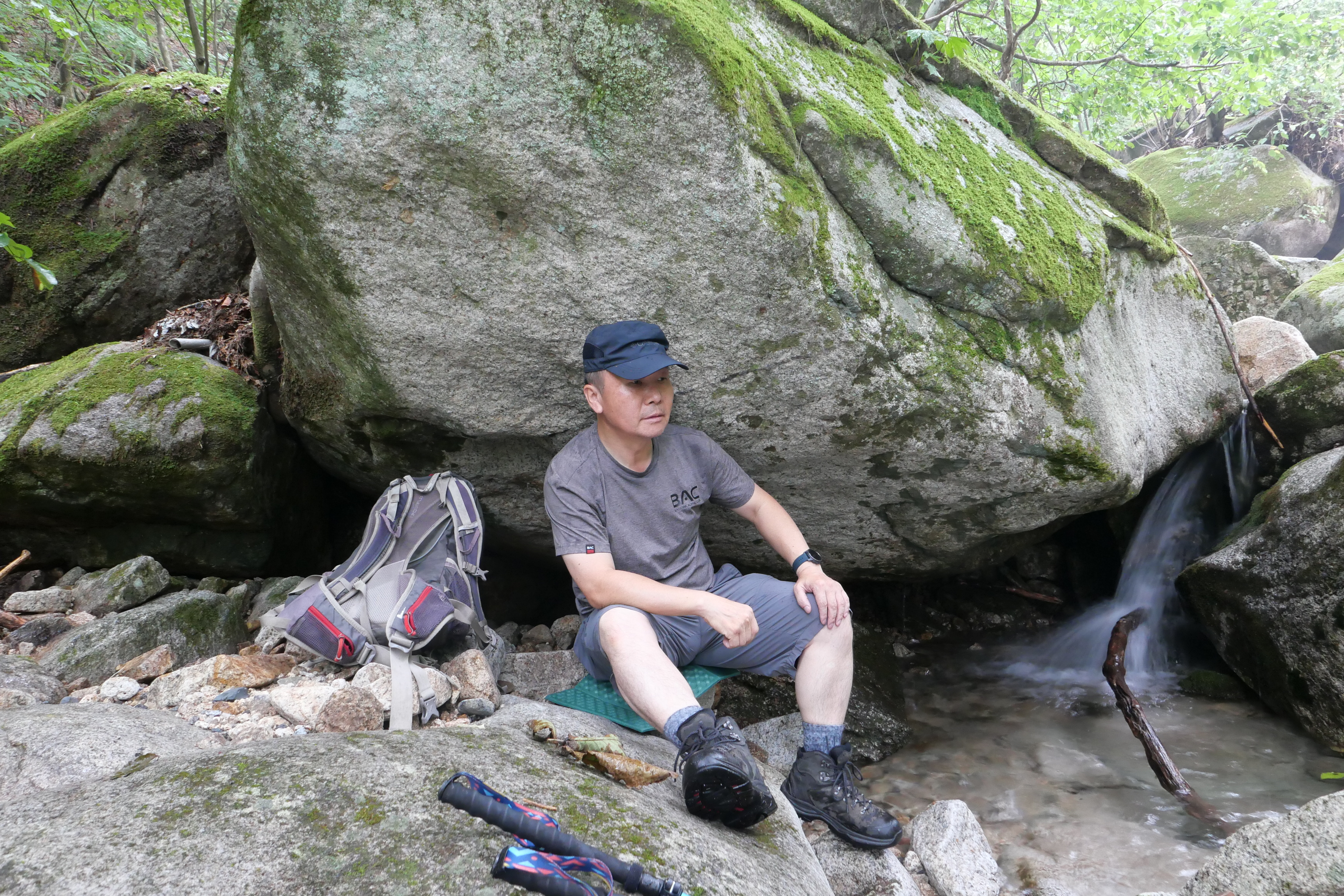 계곡에 비를 피할 수 있는 큰 바위가 보인다.