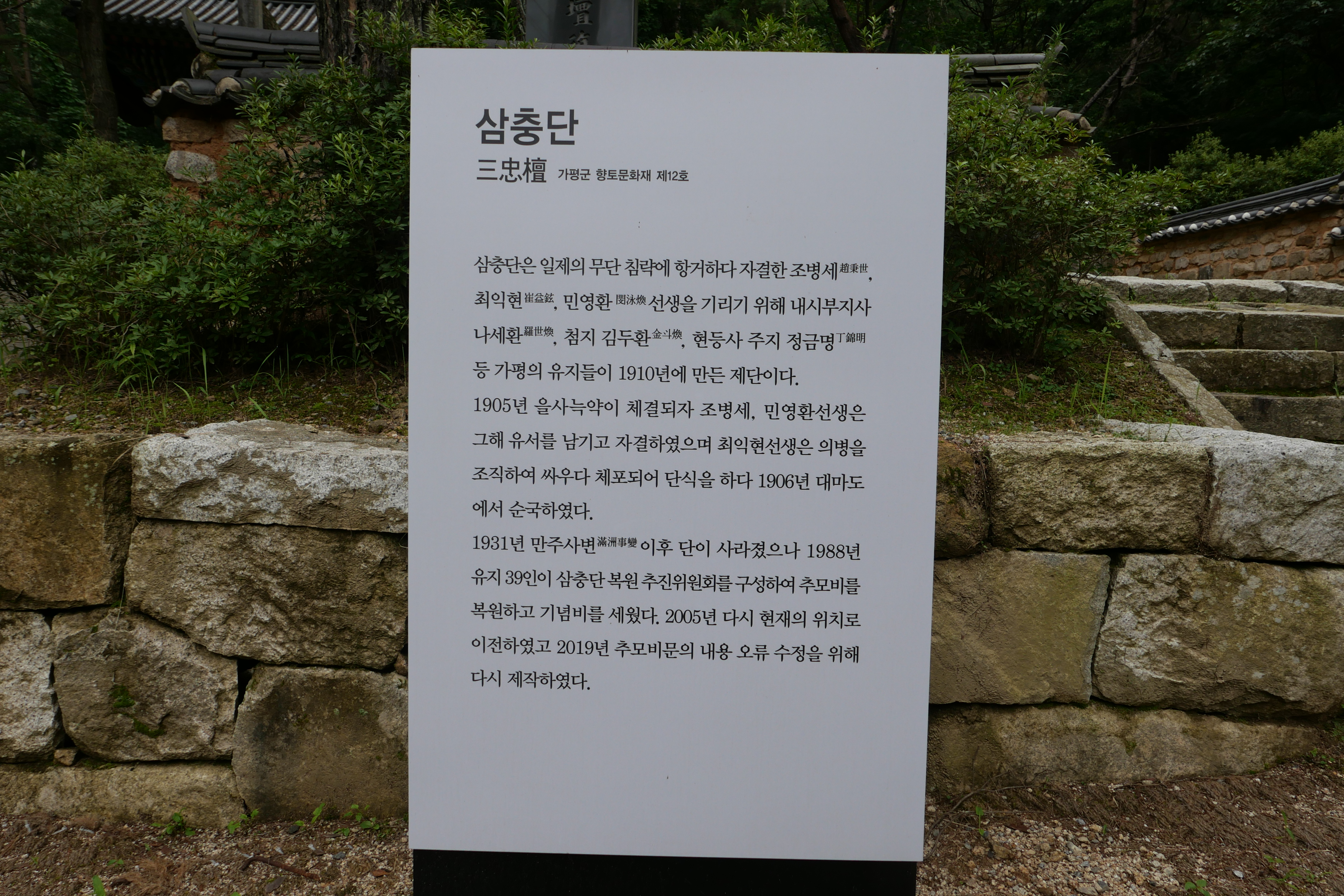 일제의 무단 침략에 항거하다 자결한 조병세,최익현,민영환선생을 기리기 위한 제단이라고 쓰여있다.